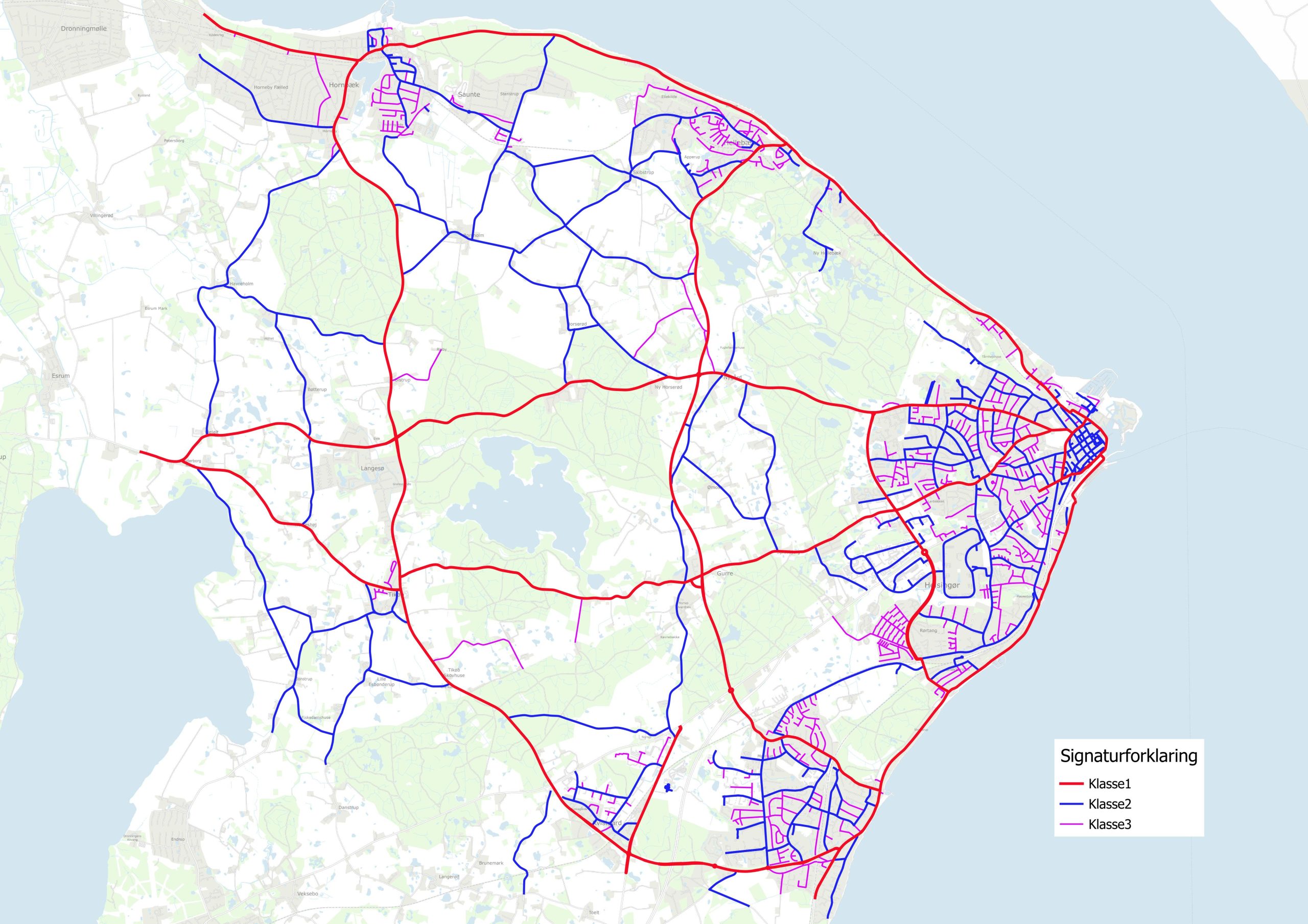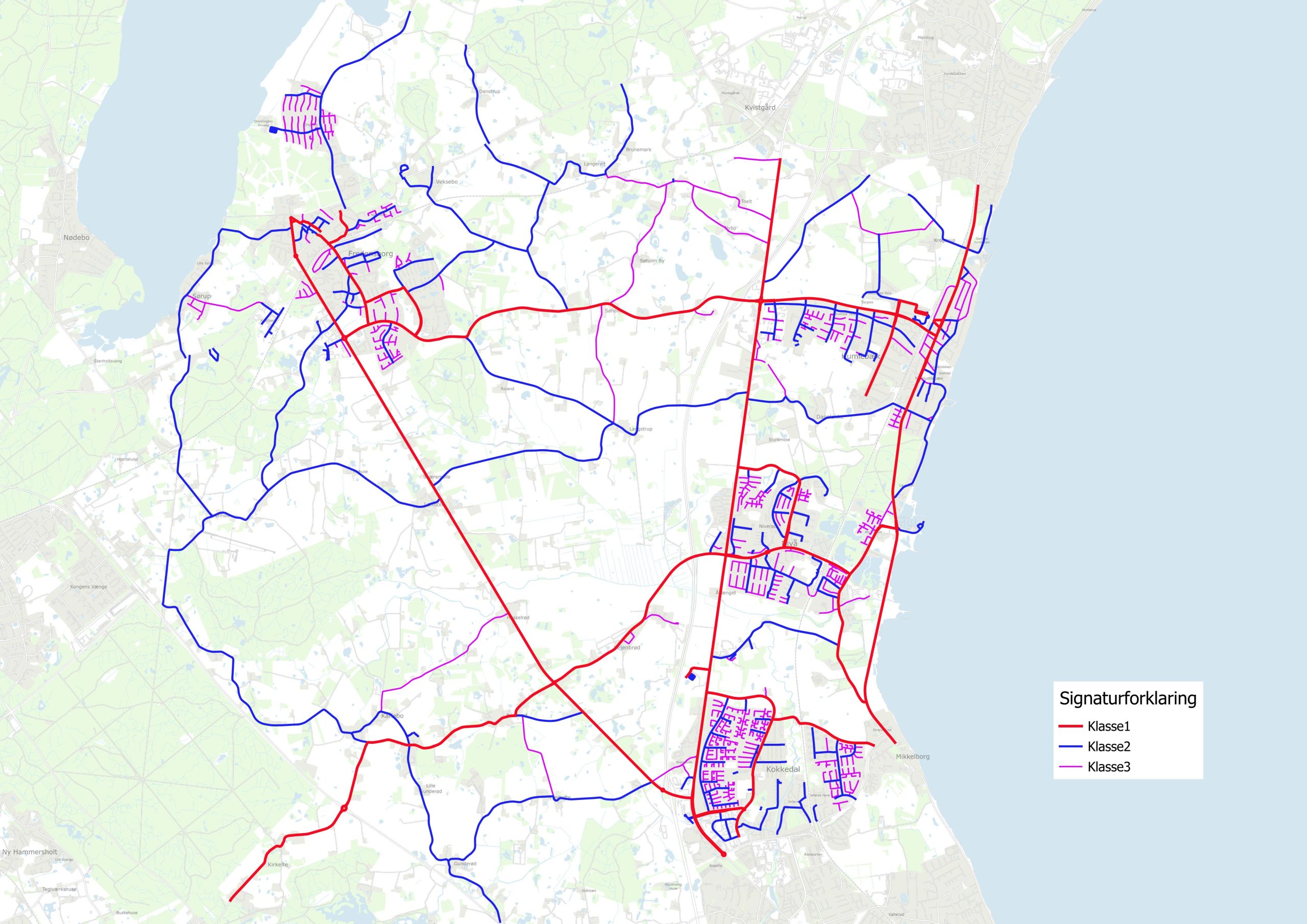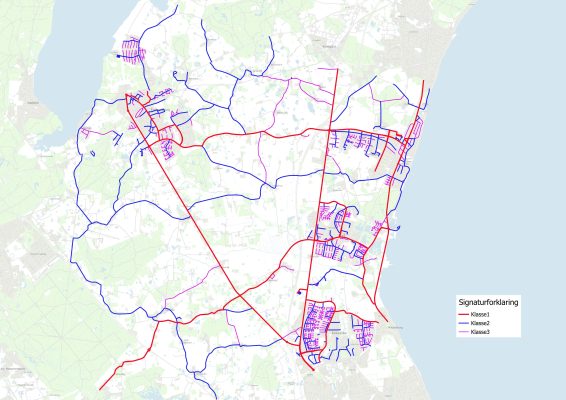 I henhold til ovenstående regulativ er alle kommunale veje i de to kommuner opdelt i 3 vejklasser. Et hurtigt overblik over vejklasserne kan ses i nedenstående kort. Nærmere forklaring og kort findes i regulativet.